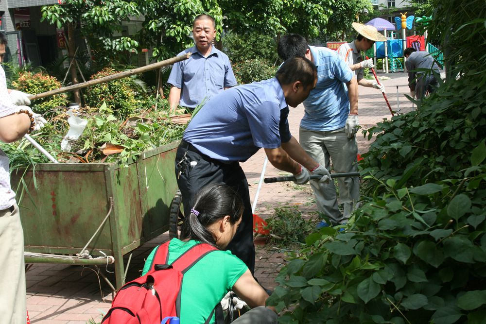 城市佳园物业服务中心经理张志和将工作进行简单分工后,所有党员兵分两路,以服务中心办公室为起点分别从区内两个相反方向开始除草、清理垃圾。党员们不惧炎热、不怕脏累,一些人用手捡拾苗木丛中的枯枝、烂叶、纸屑、烟头等垃圾,一些人用笤帚清扫地面,一些人负责装运垃圾到斗车。骄阳似火,地面气温已近四十度,党员们挥汗如雨,很快就汗流浃背,但没有一个人叫苦叫累或偷懒耍滑。临近十二点劳动结束时,很多党员的衣服已经汗湿得可以拧出水来。