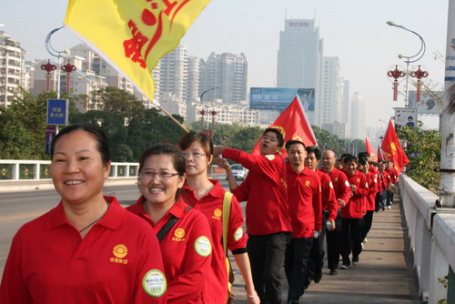 勇往直前,健走未来。11月23日,金宝集团160多名员工统一身着印有公司标志和口号的文化衫齐聚江畔花园小区广场,手举五彩旗帜,沿江畔花园—惠州大桥—朝京门—百花洲—西湖正门—西湖主景干道—西湖丰山出口—部队—城区政府—高榜山路线健步行军,完成全程近10公里“环保宣传、全民健身”徒步公益活动。
