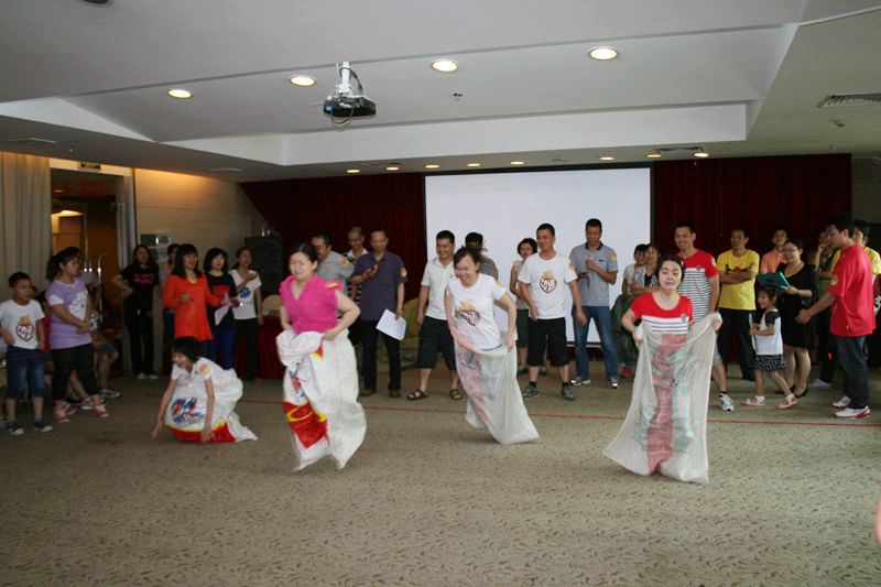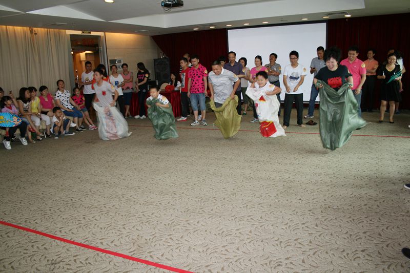 趣味运动会包括袋鼠跳、三人四足、乒乓投篮三个老少皆宜的游戏项目,不仅考验了家庭成员之间的默契协作能力,也让大家在紧张活泼的气氛中更加团结奋进。来自城市佳园的刘源源姐妹花身材苗条、动作轻盈,娇小的身材套入宽大的纤维袋中,哨声响起便提起袋子边缘,双脚并立健步如飞,两人接力完成比赛用时仅为14.44秒;人力资源部童年家庭奋起直追,以14.65秒成绩晋升第二名。总部食堂厨工朱秀珍平日里给人的印象手脚麻利,在袋鼠跳比赛中也体现出果敢能干的秉性,修长的双腿轻轻一跃就把对手甩在了身后,只是最后冲刺刹那因为太过心急双脚绊倒狠狠摔出了起跑线,所幸厚厚的地毯抵挡住了高速冲击,身体安然无恙。“爸爸加油”“老公加油”“弟弟加油”“妈妈加油”……场下家人们群情激昂地挥舞着手里的加油KT板,大声呐喊为选手们加油助威,气氛紧张又令人振奋。比赛一结束,家人们就立刻兴奋地迎上去抱成一团,为接下来的比赛加油打气。
