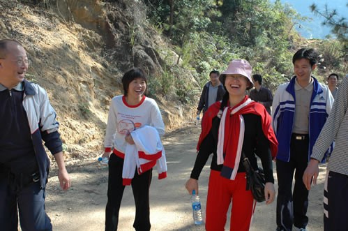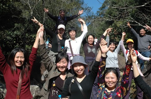 深秋的阳光灿烂而不炙热,袅袅山风轻拂着每一张笑脸,寿星们不禁深深陶醉在美景里,忘情地歌唱,欢乐地奔跑,甚至独辟蹊径,饶有兴致地溯溪流而上,尽享登山探险的乐趣。途中,大家互相关心帮助,手拉手、肩并肩穿越风景,崇山峻岭间久久回荡着寿星们的欢声笑语。